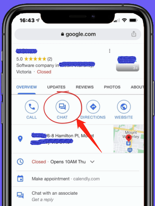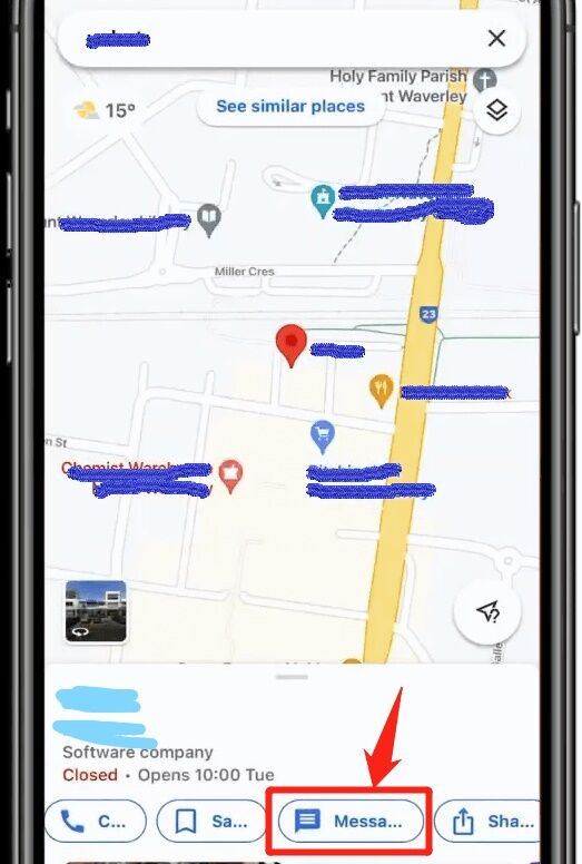 Or search your business name in Google Map. Click on the Message button to start the conversation: