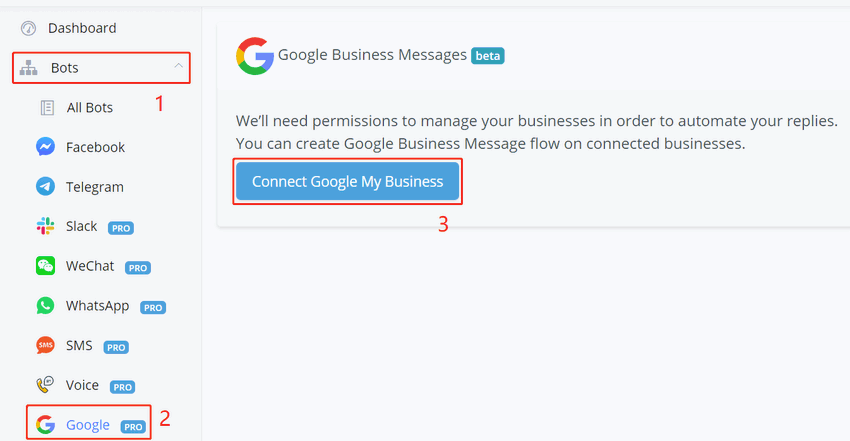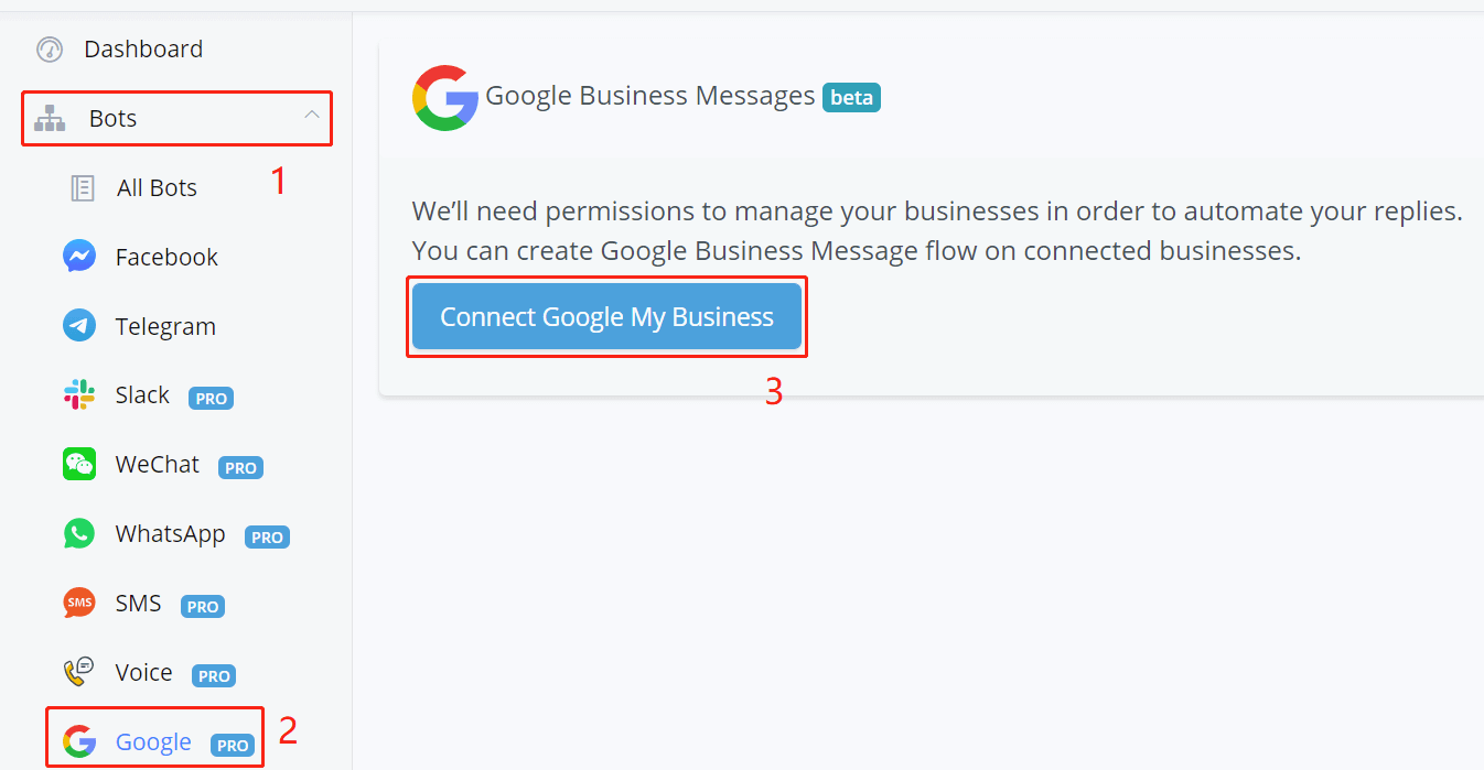 Before you launch your bot, goto *Google section on your Channel Automation dashboard. Visit the Test Url or scan the QR code to talk to the bot.