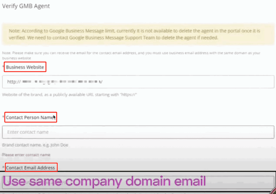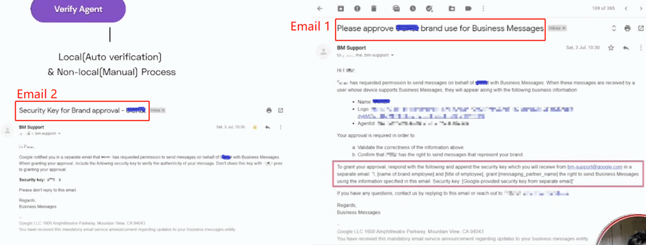 While for a non-local business, after submitting the request, you will receive 2 emails from Google. One email asks you to reply for approving Channel Automation to help with the bot automation in a specified format (security key needed). Another email will give you the security key. It will take you a few days (up to 7 days) to get your agent verified.