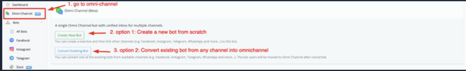 From the left-hand menu press omnichannel. You will then have two options to create your omnichannel chatbot.