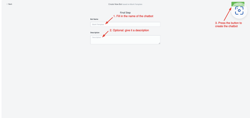 Once you made your choice you will be taken to the window where you are able to name your chatbot, along with adding a description.