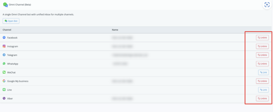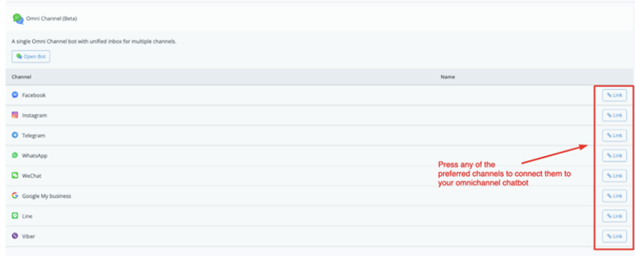 If you did not connect any channel yet to your workspace then it will take you to that specific channel to do so. Once you have added them you will be able to link them to this omnichannel chatbot.