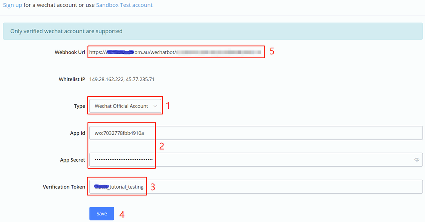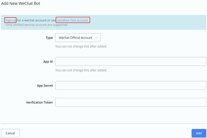 If you don't have an official account yet, click "Sandbox Test account" to test the bot with your WeChat personal account