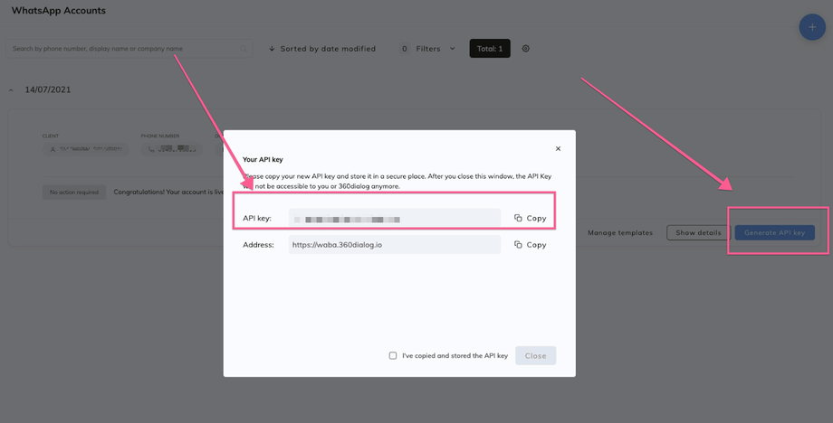 After you log in to your 360Dialog dashboard, you can click the “Generate API key” button, and then you will get your API key and address in the pop-up window like the screenshot below: