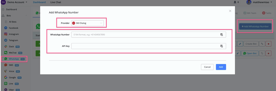 In order to connect your 360Dialog account with Channel Automation, you need to copy your phone number & API key, and then go to your Channel Automation dashboard, and go into the WhatsApp channel, click add new bots.