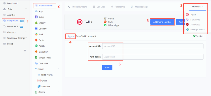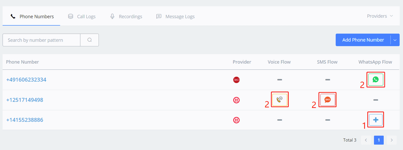 Click "Add Number" in area 3 in the above picture after connecting your provider with Channel Automation.