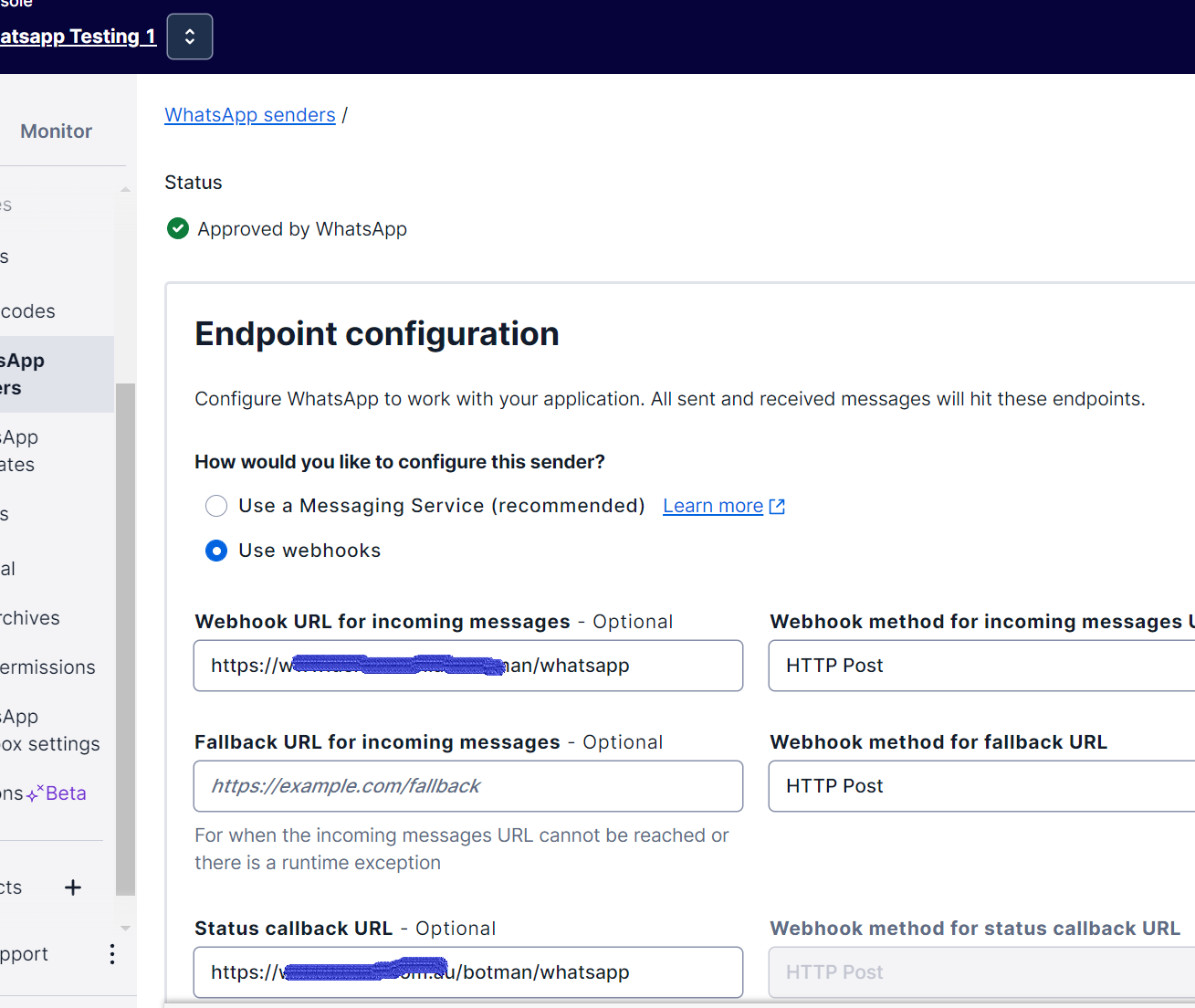 If you are using Twilio for WhatsApp channel as well, then you need to go to WhatsApp senders in Twilio, and then set up below webhook URL.