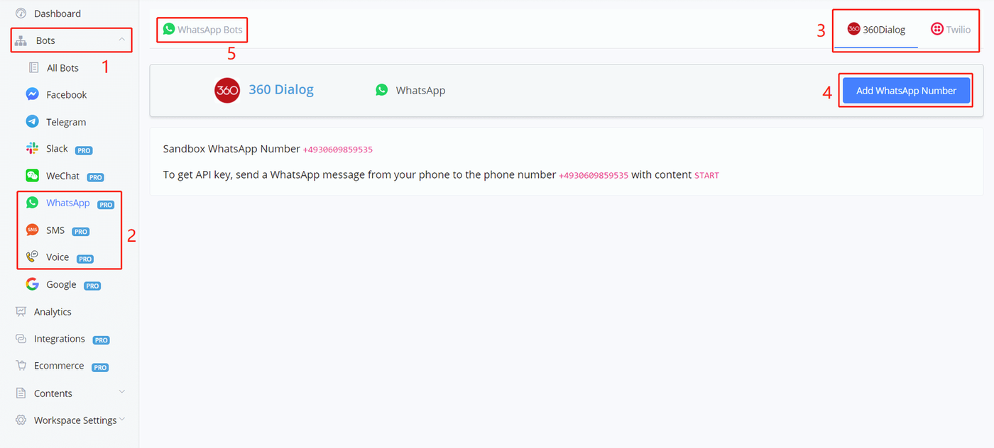 click "Add Phone Number" if you are building an SMS or Voice bot, otherwise, "Add WhatsApp Number".