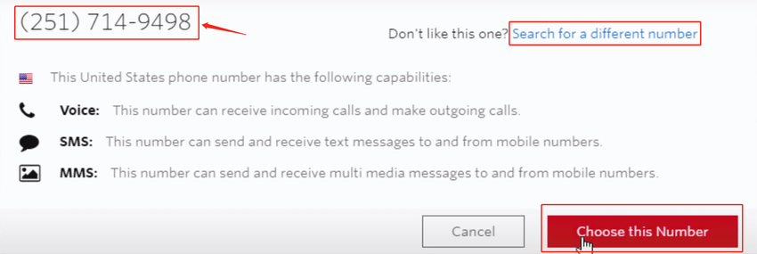 In the pop-up window, the number is shown on the upper left side, click "Choose this Number" or "Search for a different number". Then you have your own number!