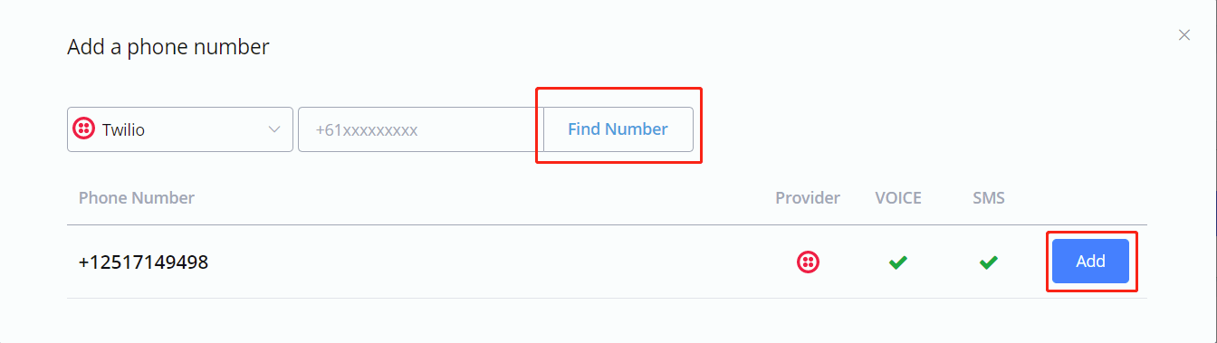 Click "Find Number", the system will search all the numbers that are under your provider account. Click "Add" to add one of the numbers.