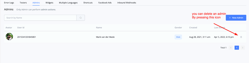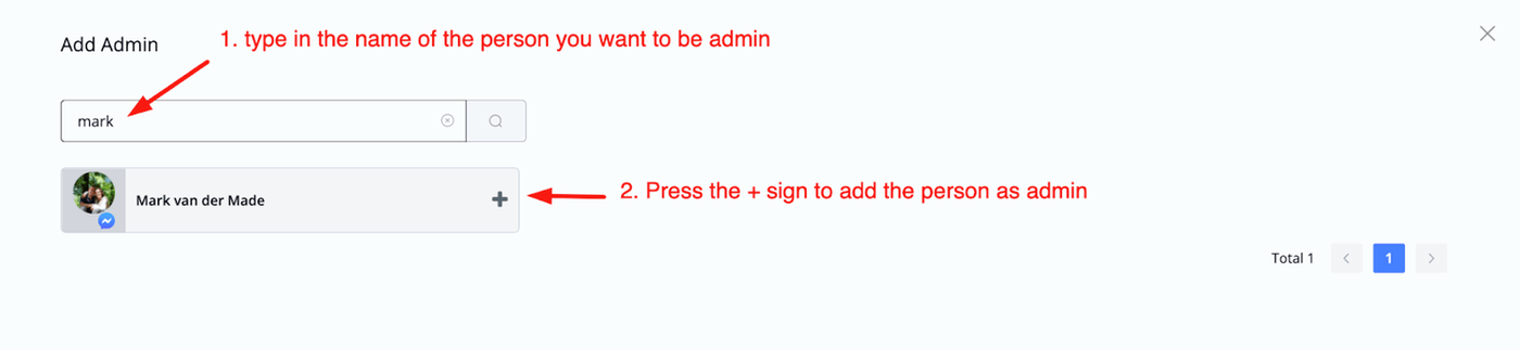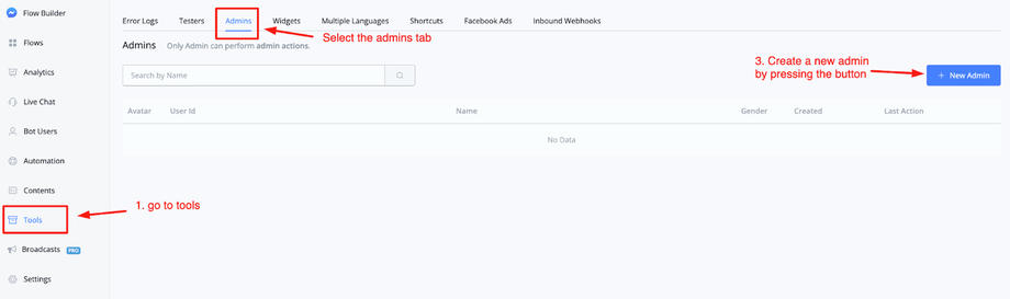 To add a new admin the user you want to invite needs to be a subscriber to your chatbot. If they are then press the button on the top-right corner named + New Admin.