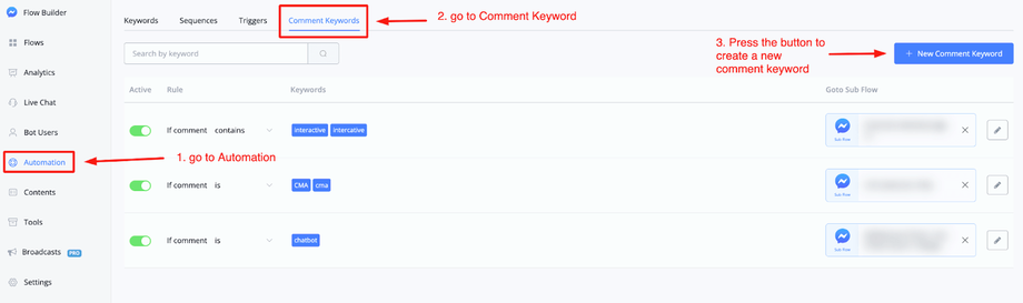 From here you will have a blue button in the top right corner name + New Comment Keyword.