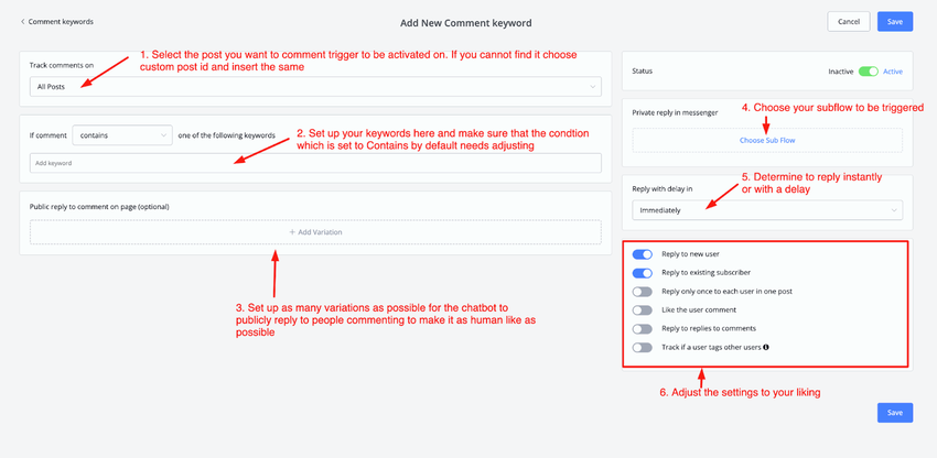 With step 4 you will be able to add the flow that will be triggered when the chatbot will send the pm to the commenter.