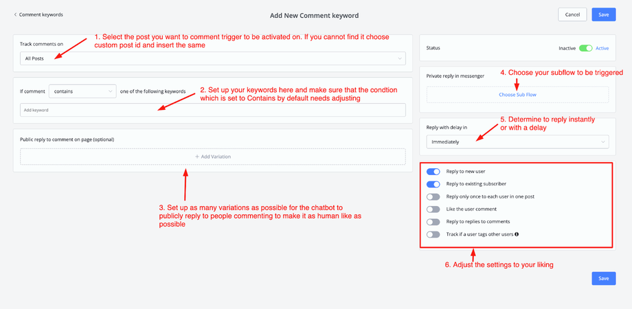 On step 3 you will be able to create variations with which the chatbot will be able to reply to users who comment on your Page posts.