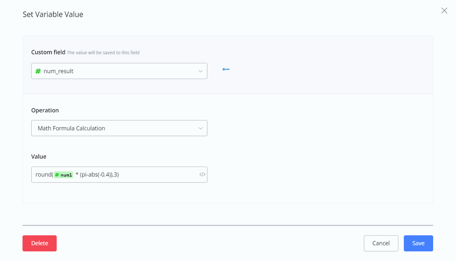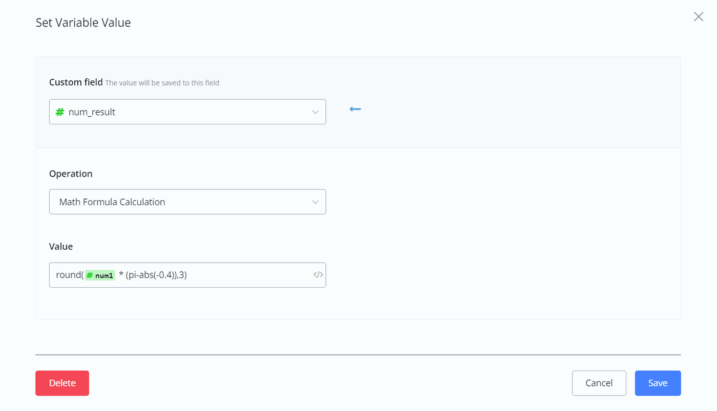 With this operation, you can now do formula calculation directly in the Action Step - "Set Variable Value" and Condition Step - "Value".