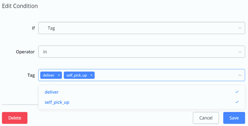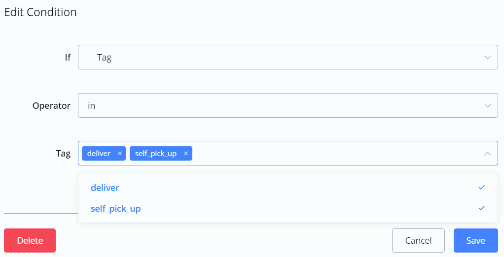 For tag and sequence condition, you can choose "in" or "not in" from the "Operator". Choosing multiple tags/sequences is allowed.