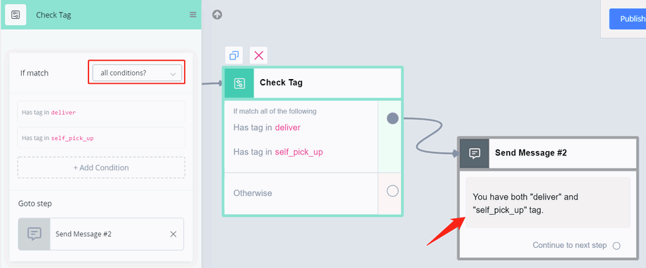 Another important thing to know is the difference between "All conditions" and "Any conditions". It is sitting at the upper right corner of each condition group.