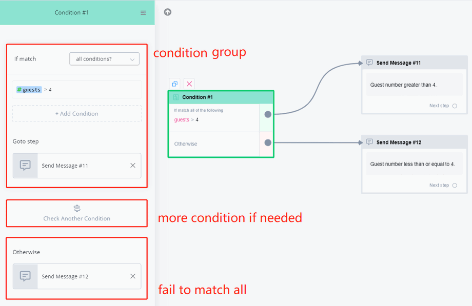 You can make as many condition groups as you need. The matching start from the top to the bottom, once a group matched, the system goes to a named step. When it fails to match all condition group, the "Otherwise" group will take over it. So it's always a good practice to name a step in the "Otherwise" group even it is very unlikely to be used.