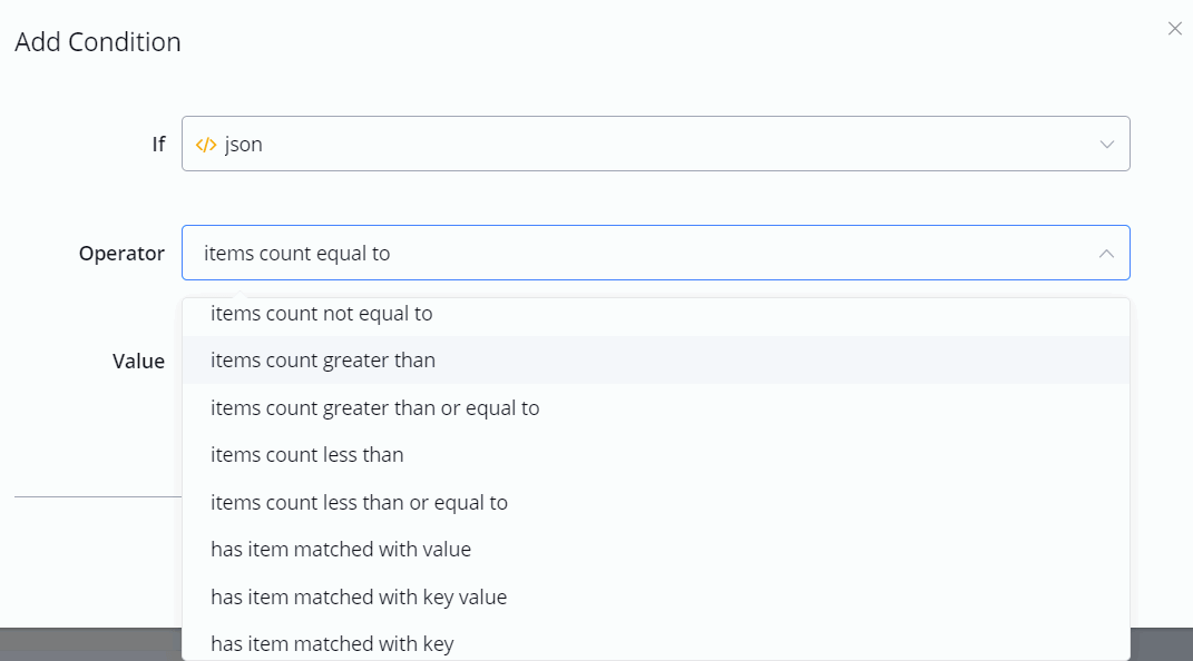 Pick a value from a JSON, then you can compare it as you use the text variable condition.