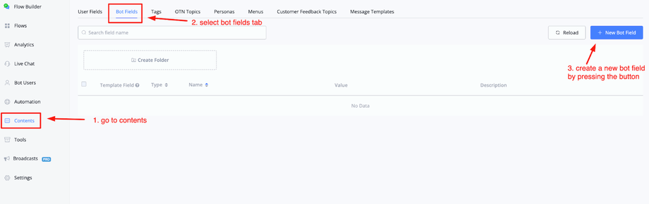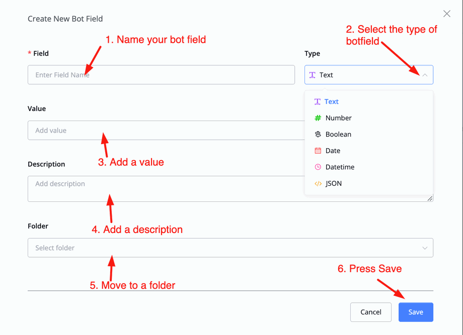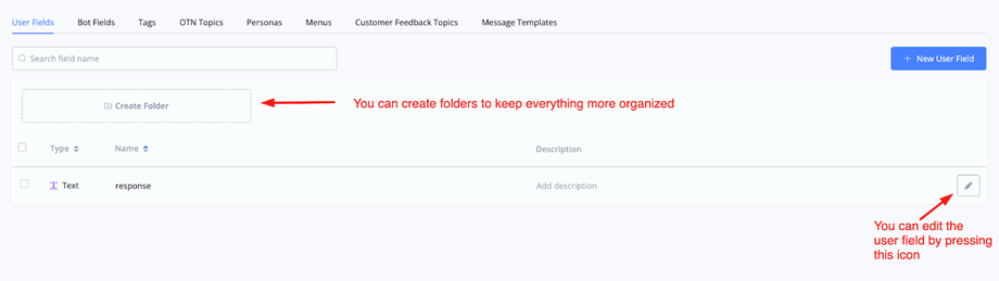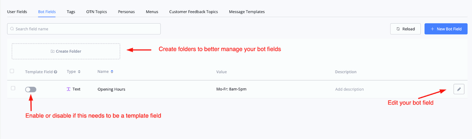 You can create folders to better keep track of your bot fields. You can also enable or disable the template field option.