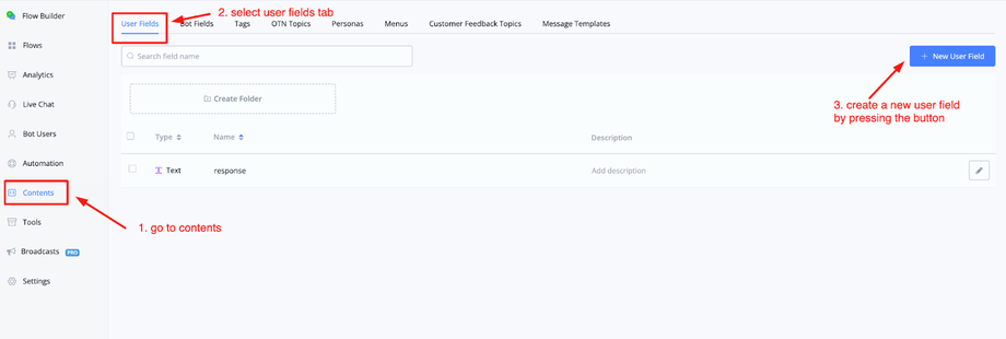 Similar to user fields you can also create bot fields. The main difference is with user fields you store data to segment and share with that specific bot user, and bot fields allow you to store data and show them all equally among all bot users.