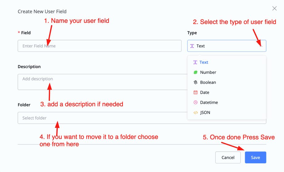 You can also add a description if you like and or want to clarify what the function is. Below the description, you will be able to select whether or not you want to move it into one of the folders you might have created to keep user fields more structured and easy to find.