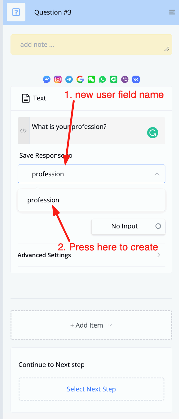 Another way to create a user field is by doing so directly inside the flow builder. This has the huge advantage that you can create user fields on the fly and not have to go to the user fields overview tab first.