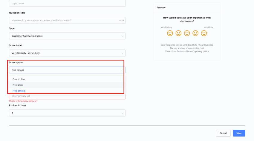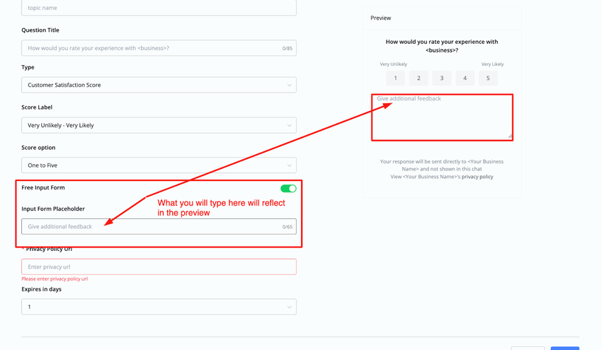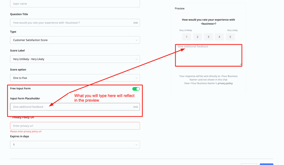 Below that you will be able to point to your privacy policy which is mandatory. And lastly, you will be able to set the customer feedback to expire anywhere between 1-7 days.