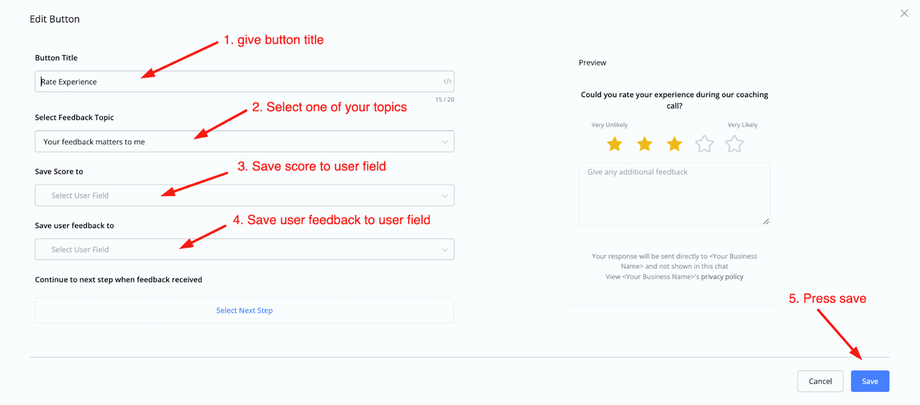 You will then be able to give the button a title, select the topic you want to use and save the responses to a user field. Once done press save you will be able to send this customer feedback to any user that enters the flow and this block.