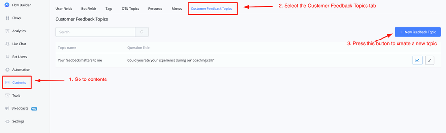 To create a new customer feedback topic you can go to Contents, then select the Customer Feedback Topics tab.