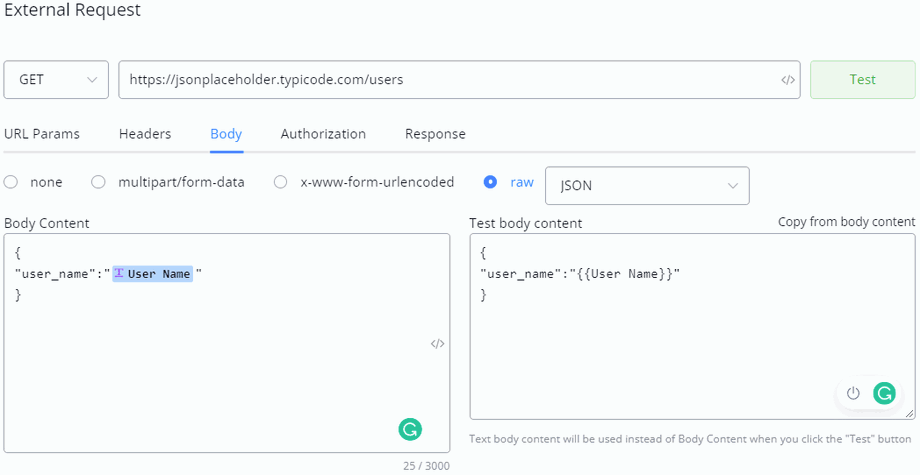 On the left-hand side, Body Content, paste or write your JSON first, when you insert a variable, the Test body content shows on the right side immediately. It's to specify a testing JSON value.