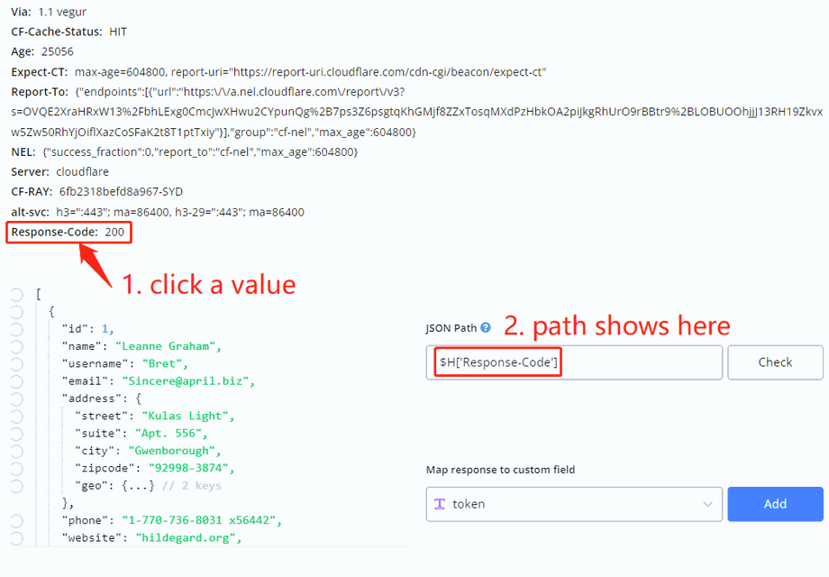 Besides the tips about how to map data above, you might also want to save the values in the response header for later use. Simply expand the header, click on a value in the header and the JSON path to it shows automatically there.