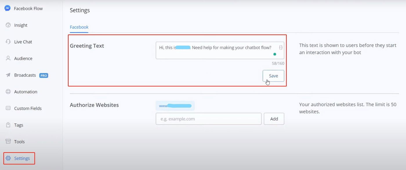 Click "Settings" from the left sidebar, put your greeting text and click "Save". That's it!