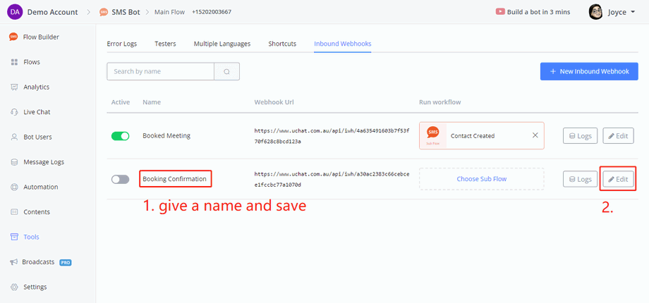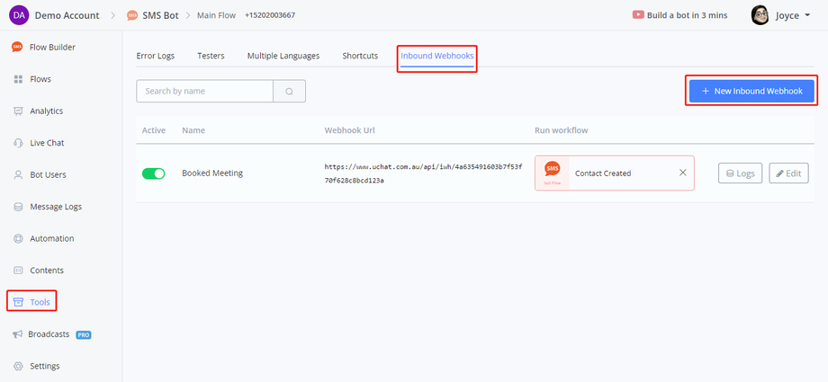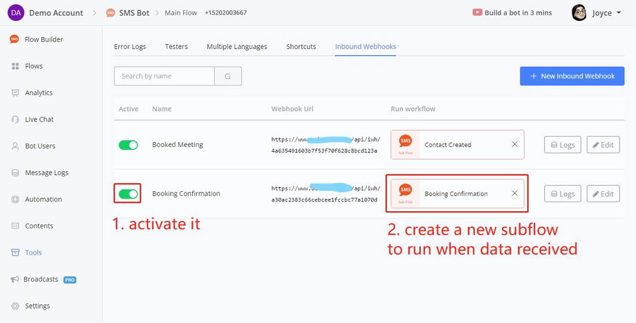For example, when a client fills in their contact information on your website, you send the data to an inbound webhook of a chatbot, say an SMS bot. The SMS bot can then send a confirmation message to the client's phone number.