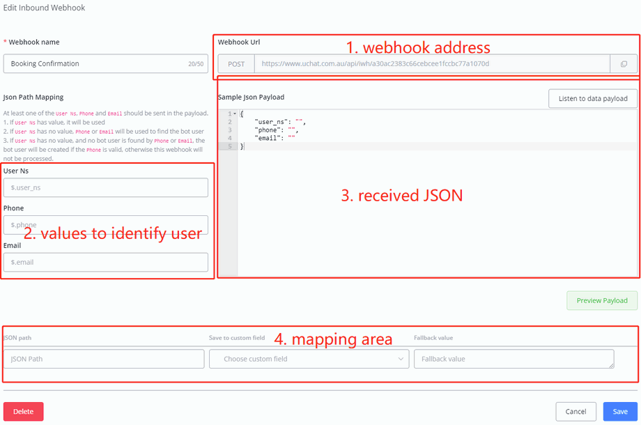 Whenever the webhook receives data, it first checks the paths you specify here to see whether it can find an existing user in the chatbot.