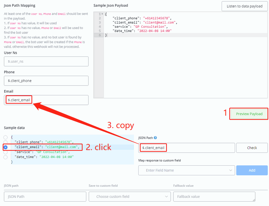 Scroll down a bit, follow steps 1, 2, 3 to tell the system, where is the phone and email values in the JSON: