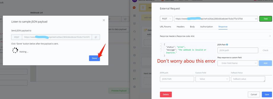 Provide the data that need to be sent to the chatbot and click Test, you must get a "webhook inactive" error since we haven't activated it yet. It's fine, click on Done on Page 1, and you will see the data saved: