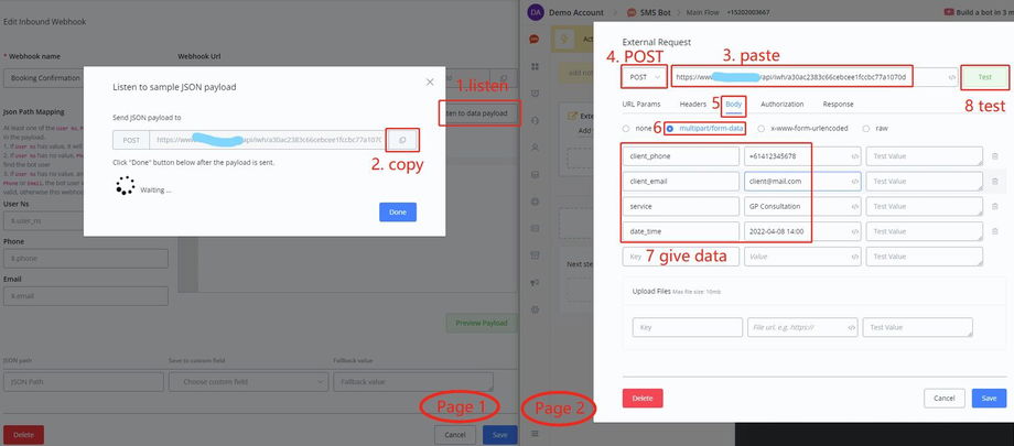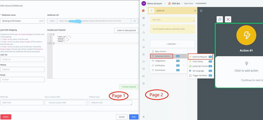 Open another Channel Automation webpage side by side, keep the inbound webhook editing on Page 1 and select an external request on Page 2: