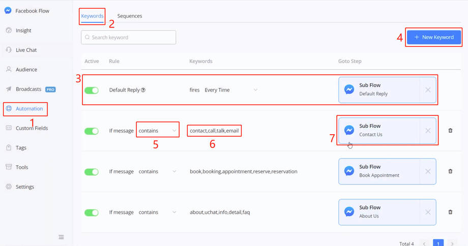 With "Keyword", your users can easily jump to sub flows by typing in keywords rather than being lost in menus or buttons.