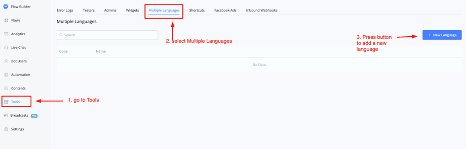 To add a new language just go to Tools from the left-hand menu, then select the Multiple languages tab.