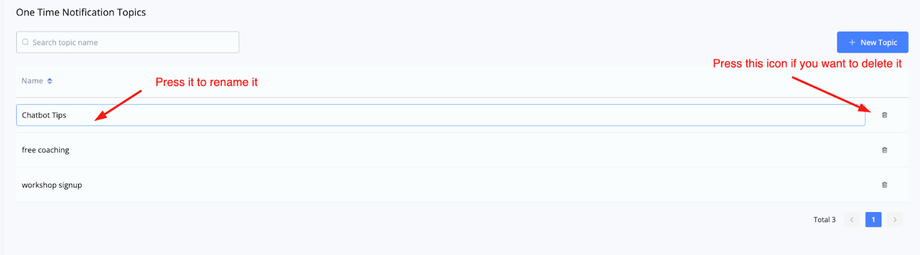 You will also be able to rename the topics by just pressing it and typing in your new name for it, or delete it by pressing the trash bin icon on the right of any topic.