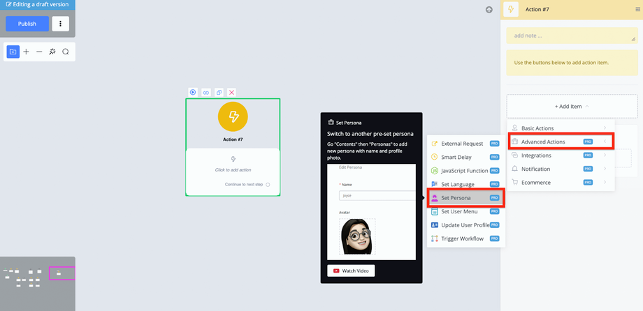 Just go to a flow and create an action block. From here select Advanced actions, then Set persona.