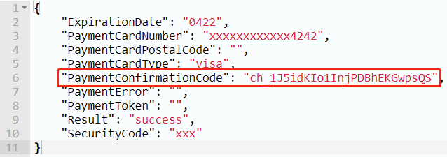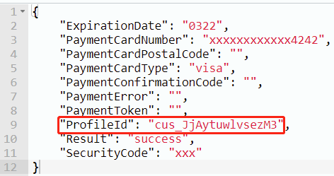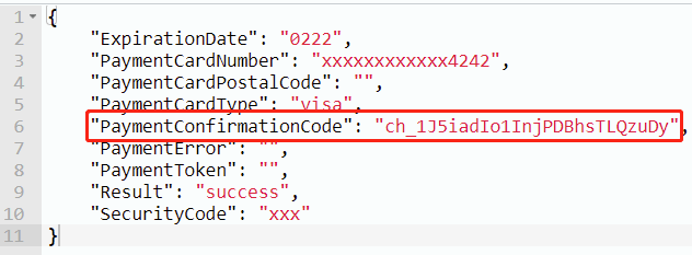 You will need a JSON variable to hold the payment result. This is a response example including some card details, confirmation code and payment result.