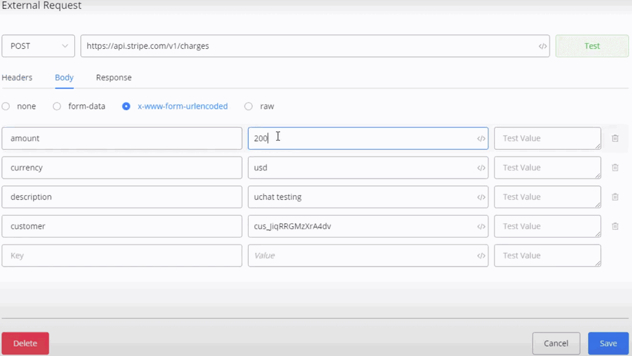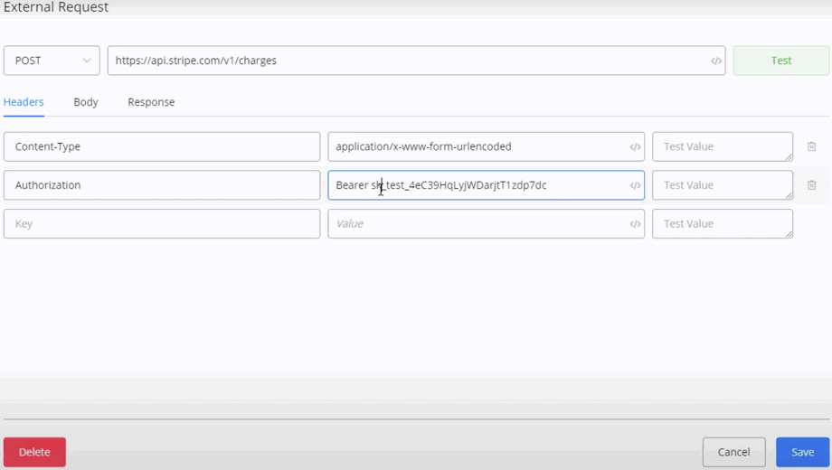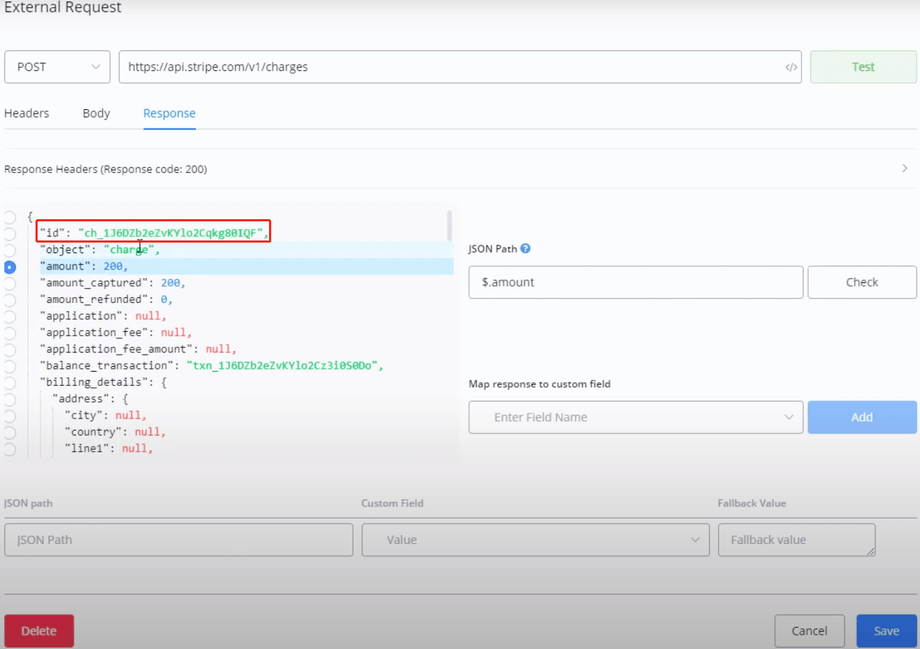 In the example, a post request is sent to Stripe with a testing API key and a charge amount, currency and the reusable token, i.e. the customer ID.