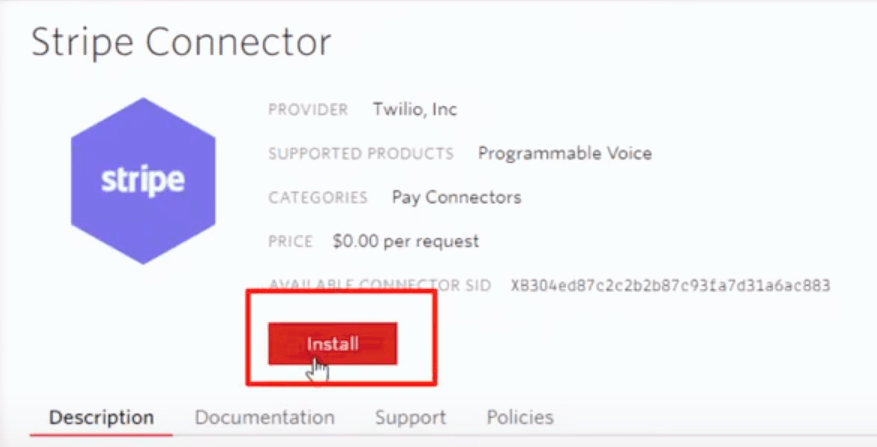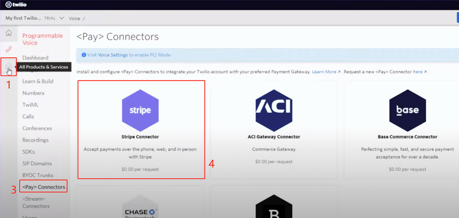 To get a "Payment Connector", which is "Unique connector ID", you will need to access your phone number provider and payment service provider. Twilio and Stripe, for example, go twilio.com, follow step 1 to 4 in the following 2 pictures: