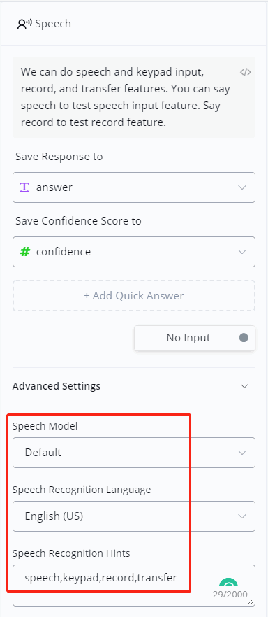 Select correspond speech model and language. "Numbers and Commands" speech mode can help improve the recognition rate when the answer is a string of numbers, etc. Please note that, Twilio charges for using this mode. More importantly, provide the bot with some hints, keywords that might appear in speech (separated by commas and no space).