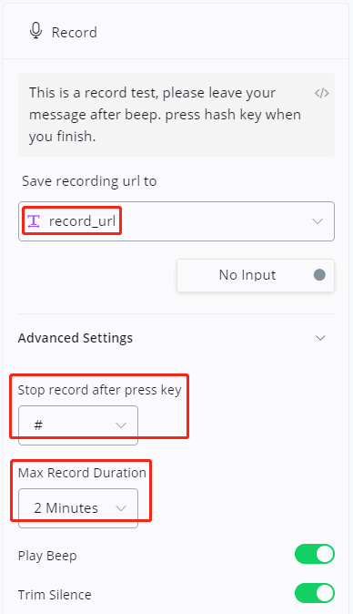 Again, same as asking for picture, audio, video or file, you will need a text variable to save the URL link of the record file. Check advanced settings for more details such as "Stop Key" and "Max Record Duration".