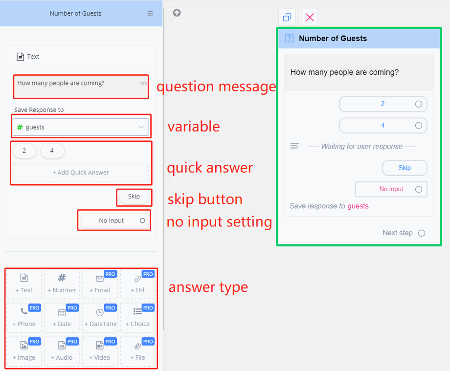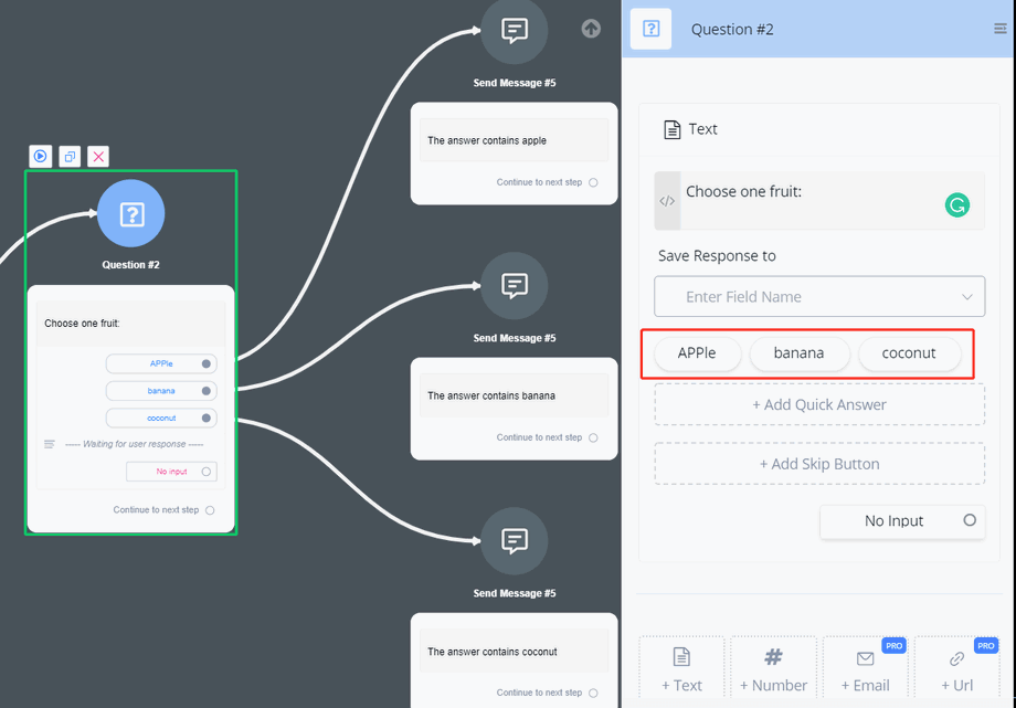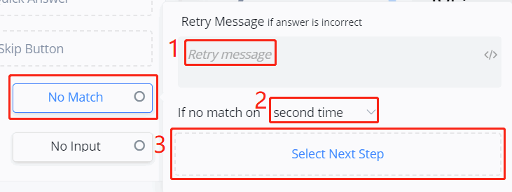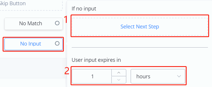 Similarly, "No Input" helps you redirect the flow when user input expires. By default, a question expires in 1 hour. Make it shorter if needed.