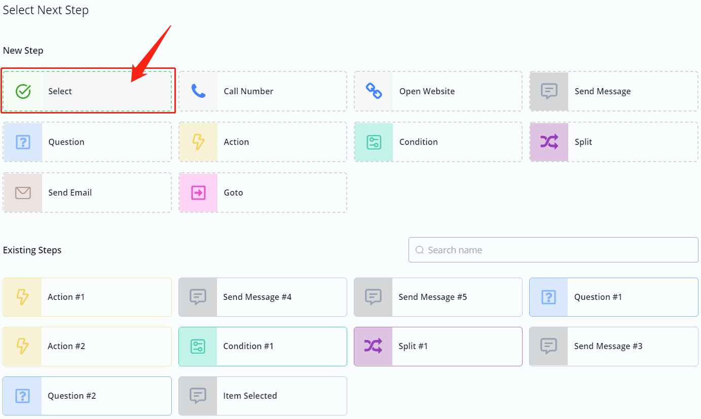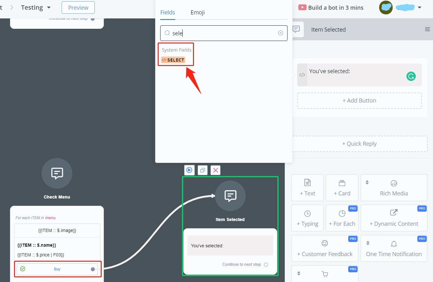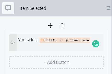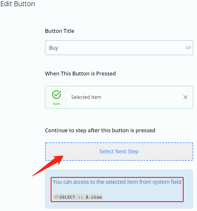Then select a next step as you usually do, like a Send Message Step to show the selected item or Action Step to deal with the data. You can then access the selected item in "SELECT":