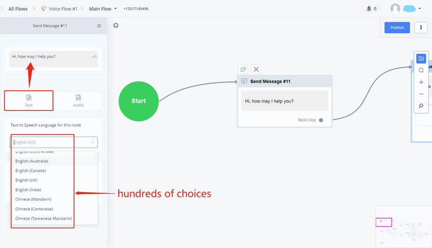 Note - For voice bot, you can set a default language at the Green Start Point or set it separately for each send message/question step.